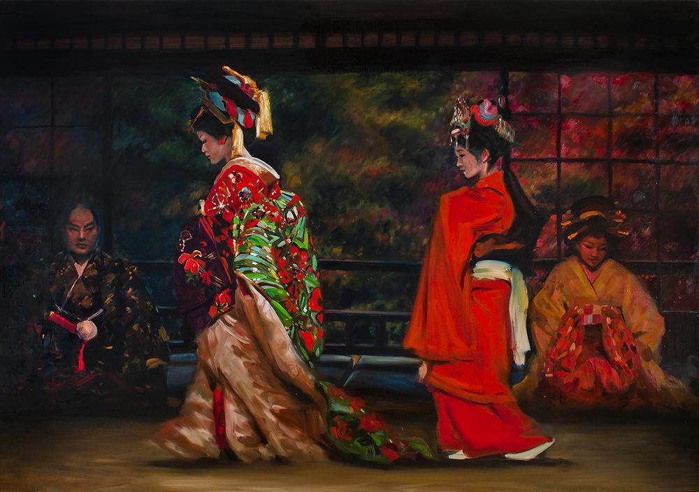In the heart of this captivating artwork, a scene unfolds like a delicate dance of colors and emotions. The shades of ruby and emerald intertwining, giving birth to a tableau that whispers stories of a different era. Two figures stand at the forefront, each holding a unique presence. The graceful geishas, with their measured steps, exude an air of refined elegance. Their movements are deliberate, mirroring the essence of their role as the bearers of tradition, culture, and grace.